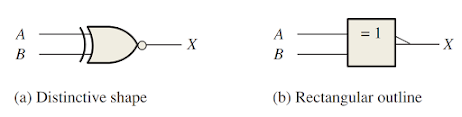 Standard symbols for an exclusive-NOR (XNOR) gate are shown in Figure 2. Like the XOR gate, an XNOR has only two inputs. The bubble on the output of the XNOR symbol indicates that its output is opposite that of the XOR gate. When the two input logic levels are opposite, the output of the exclusive-NOR gate is LOW. The operation can be stated as follows (A and B are inputs, X is the output):